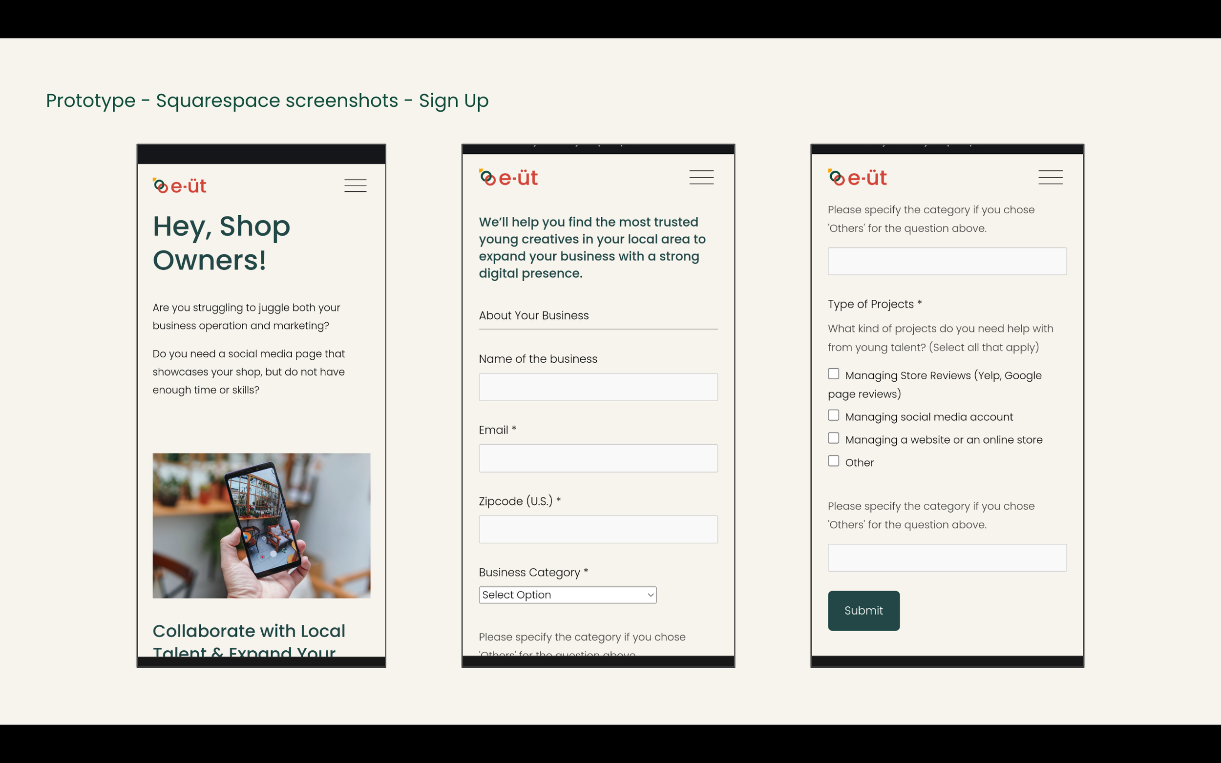 e-üt [이웃; neighbor; neighborhood] : A non-profit organization that hires and trains young talent and connects them to local businesses to gain real-world experiences while providing their creative and digital media skills to uplift neighborhood shops.